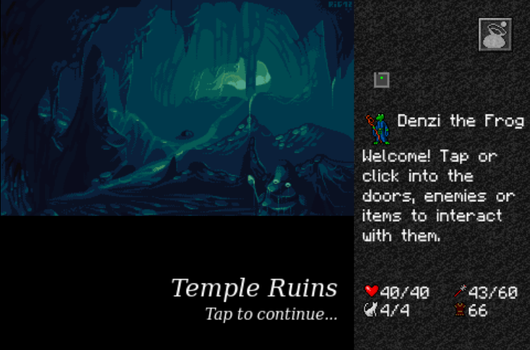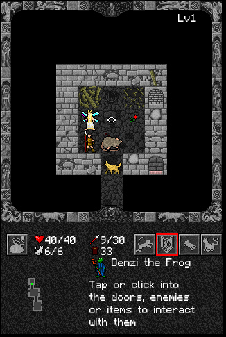 Fixed a bug that made it cumbersome to return to previous rooms when you had a pet. I also added a sample of the location scenes, you’ll get to see one of those every time you get to a new environment. All credits for the pixel art go to Merez from pixelJointΒ . Denzi is currently working on one of our own.