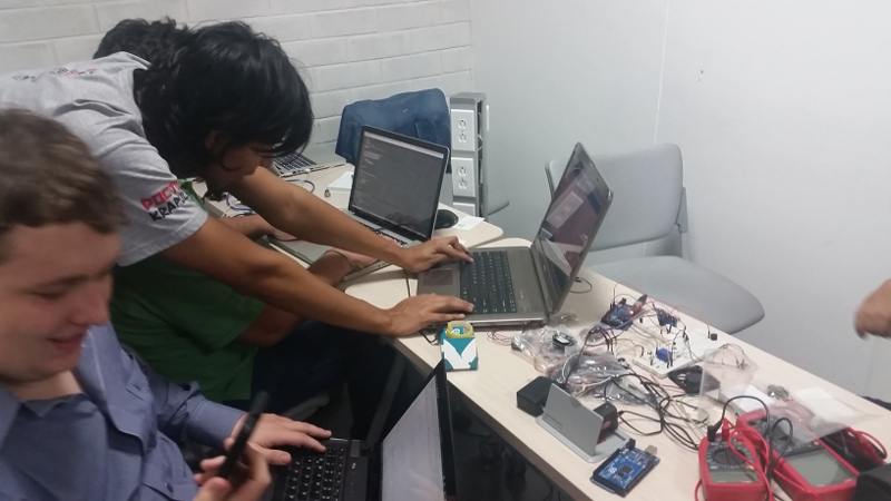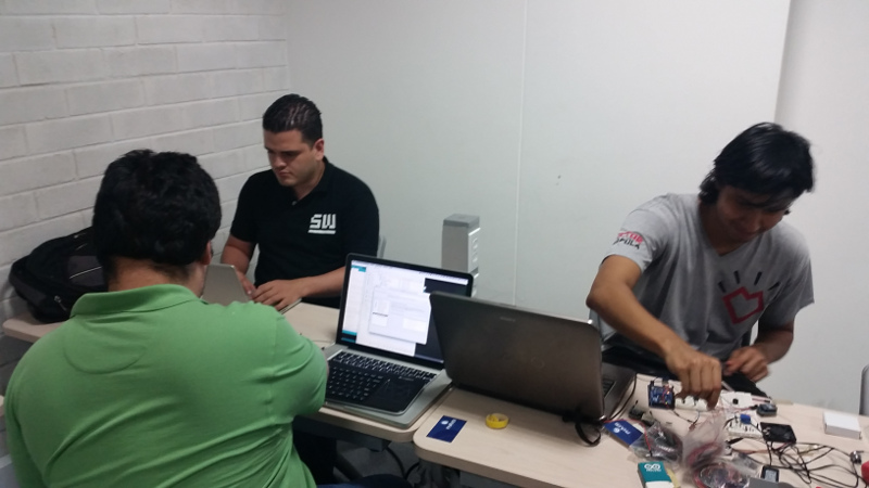 I had no idea what to do since I know nothing about electronics… the sponsors facilitated an array of boards / microcomputers and other components (Arduino, Raspberry Pi and some other fancier stuff from Intel and more), but it was a very short time for me to learn how these work and deliver something; I thought on doing a simple game using the Geolocation API so I could work with just smartphones, but in the end I pitched myself as a volunteer from the software side to a team with an existing idea, I needed to know how these things work.