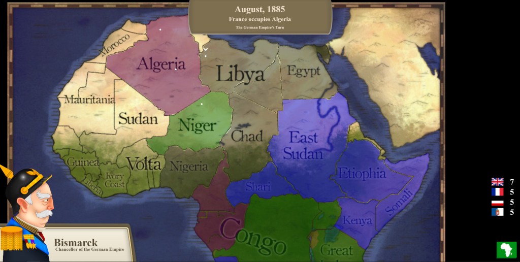 1884 – Golf Over Africa, is available for free on the itch.io game portal, through which the developers are accepting contributions to further develop the game to include A.I. opponents, multiplayer support, and more European powers.