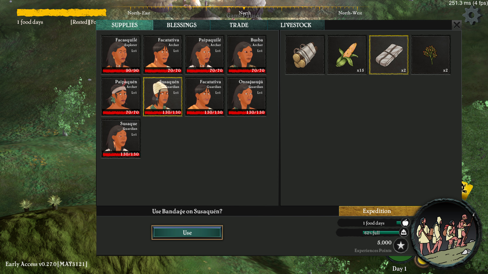 Before this change, you saw your expedition move at a constant speed on the map, no matter how tired they were or what terrain they were traversing. Instead, the speed at which the time moved forward was affected by different factors; this was made out of convenience to avoid the player being crawling in the map which might be frustrating and boring. However, we found out it was difficult to communicate the actual speed you were walking, and instead, players sometimes felt days were too short, or battles were happening too quickly.