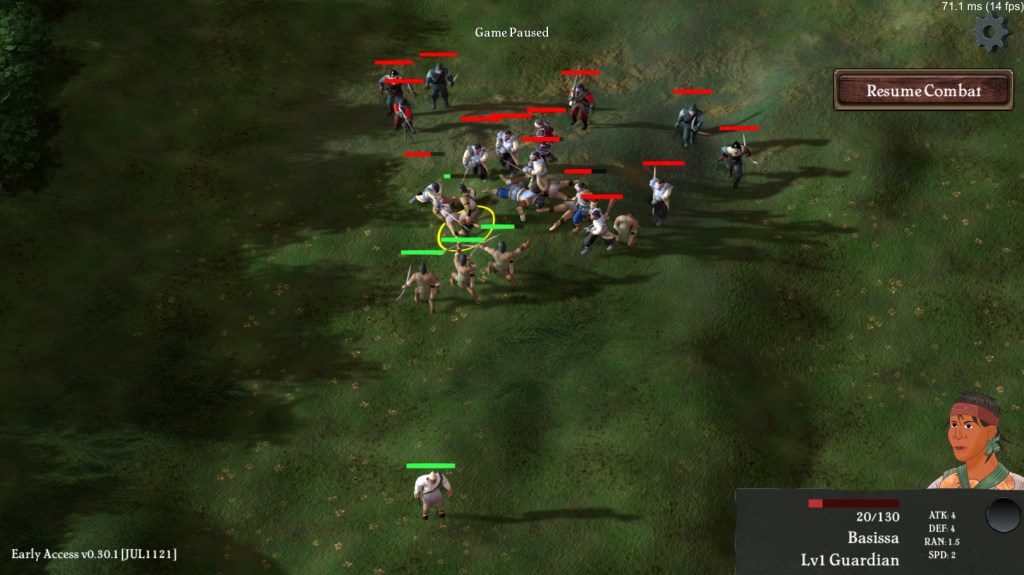 We still need to work on a big iteration for the combat aspect. That was the plan for these two weeks but things went in a different direction. At least we worked some small improvements for usability, making it easier to select units by increasing the size of their click mask, and increasing the zoom overall of the combat scene since we weren’t making full use of the screen real state anyways (our battles are small skirmishes, max 15 vs 15 units and commonly stuck together real close, so we were wasting a lot of space.) Maybe we should allow the player to zoom in and out in this scene since the zoom level is untied to the exploration range (unlike in the normal overworld mode)