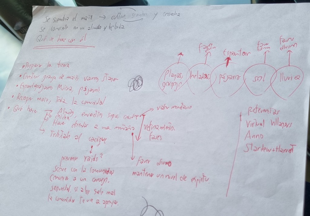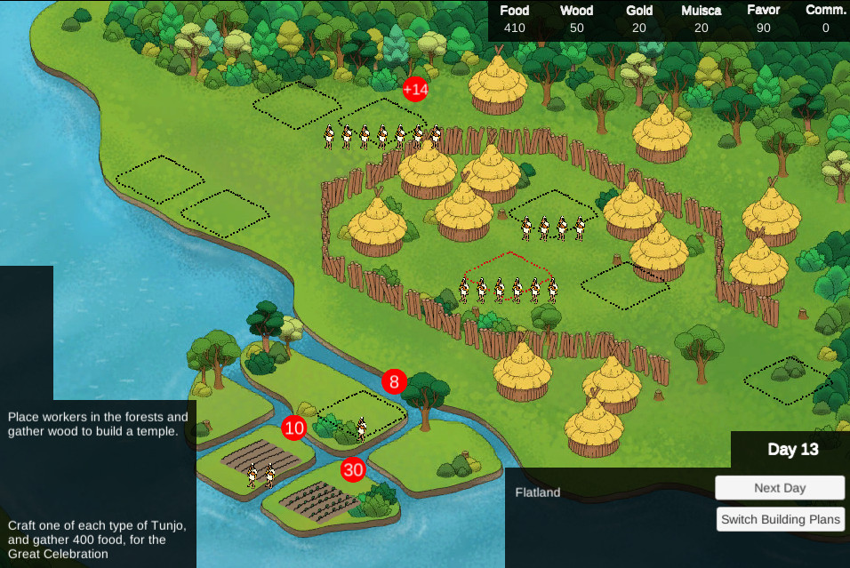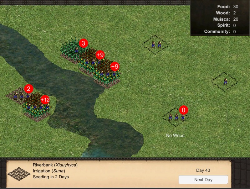 The team meets. Initially, I had the idea of leaning more into the educational and narrative aspects, but David thinks we should shoot for a game with deeper mechanics and gameplay. We decide to go for a strategy/simulation/tycoon game where you lead a Muisca community toward a still unclear objective. All we know for starters is it’s going to have some farming, building, and crafting elements, that we want to teach about the Muisca culture and language, and that we will stick to a single screen map with mouse interaction, for desktop.