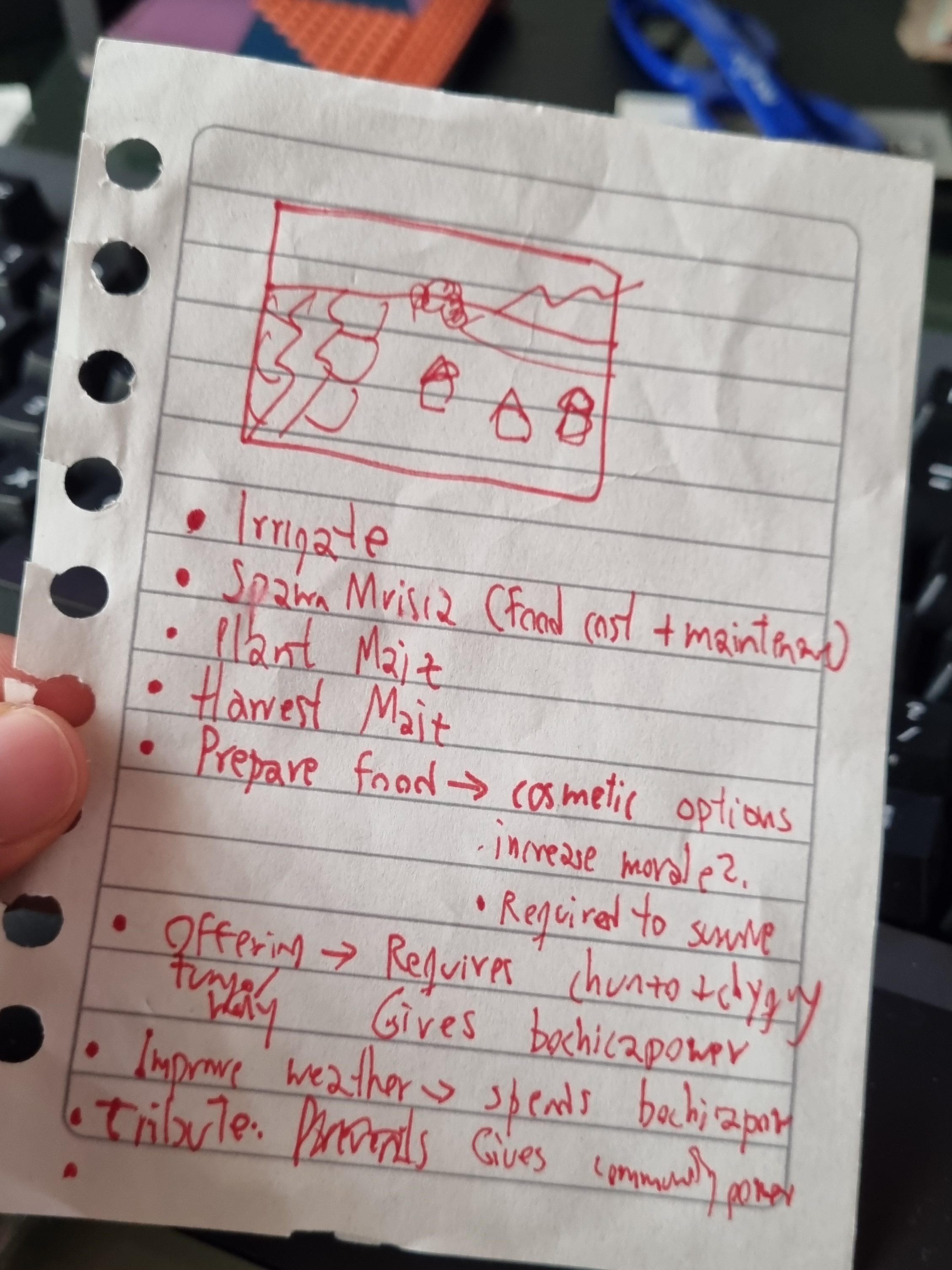 From there, he extracted some ideas for the setting, the types of events that could happen through the development of the game, some possible ways the “religion” system could work, and the final goal of the game being the preparation of a great celebration.