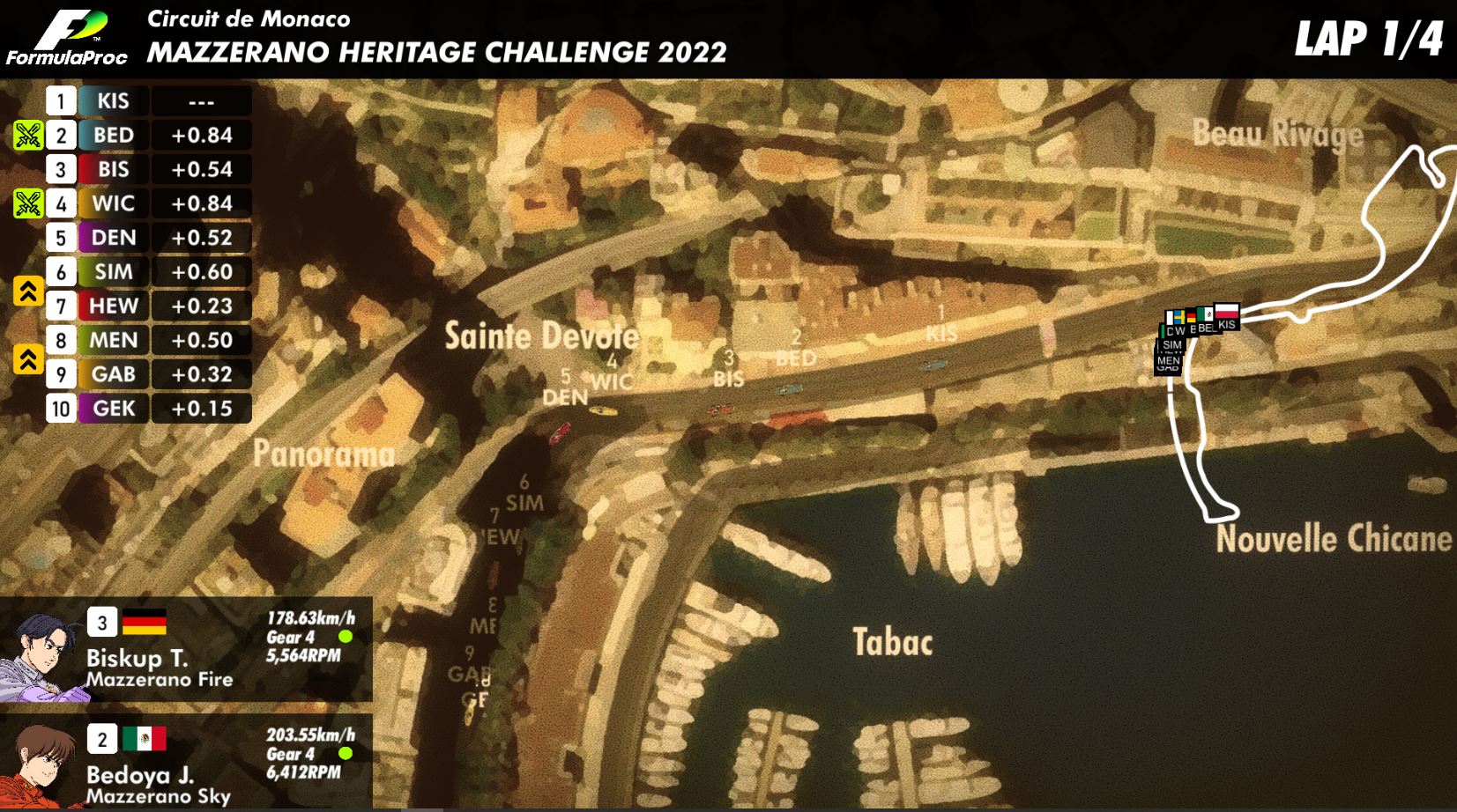 All drivers competed under identically spec’ed vehicles; besides, we experimented with some post-processing effects, including a sepia tone, vignette, and grain; these were barely visible in the quality of the streaming.