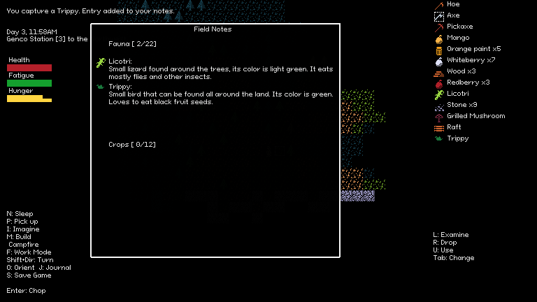 Another big late change included in the version was the first version of the “Discovery Journal” or Field Notes, as they are called inside the game; we are now keeping track of the animals you have captured or the crops you have harvested. This is just a first effort at giving players a sense of progression in case they want to embark on the task of discovering the world.