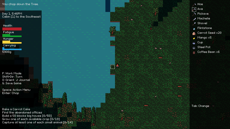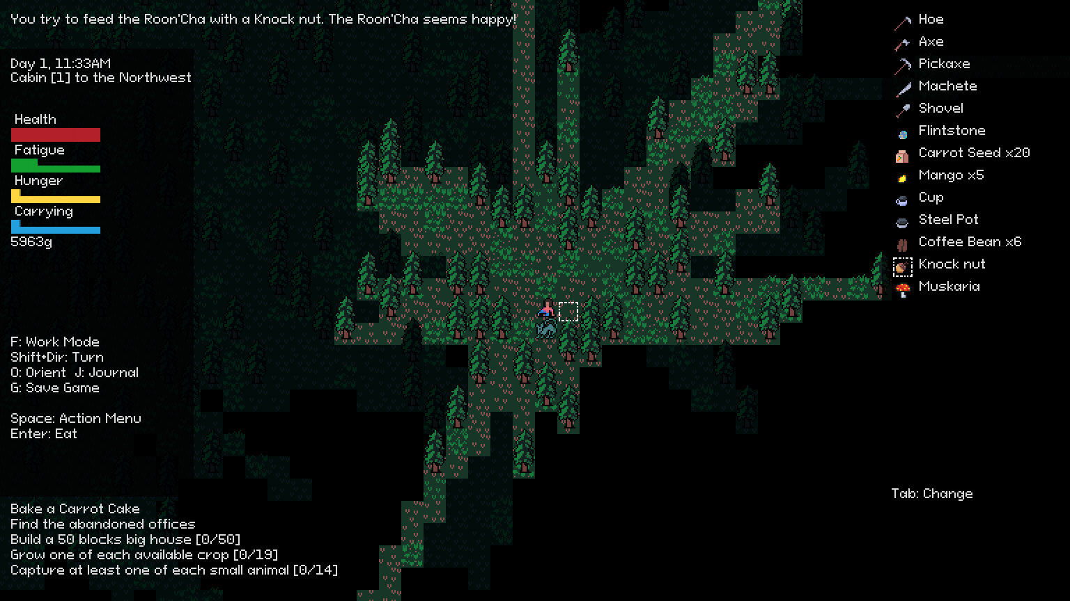 Although we will be focusing on the developments around animals in a future milestone, a tweak was needed to prevent out-of-control exponential breeding; now you will have to feed them daily in order for them to progress through their breeding cycle. There is a new command for this (Shift+F, Feed), and it can also be accessed from the actions menu when you are in front of an animal.