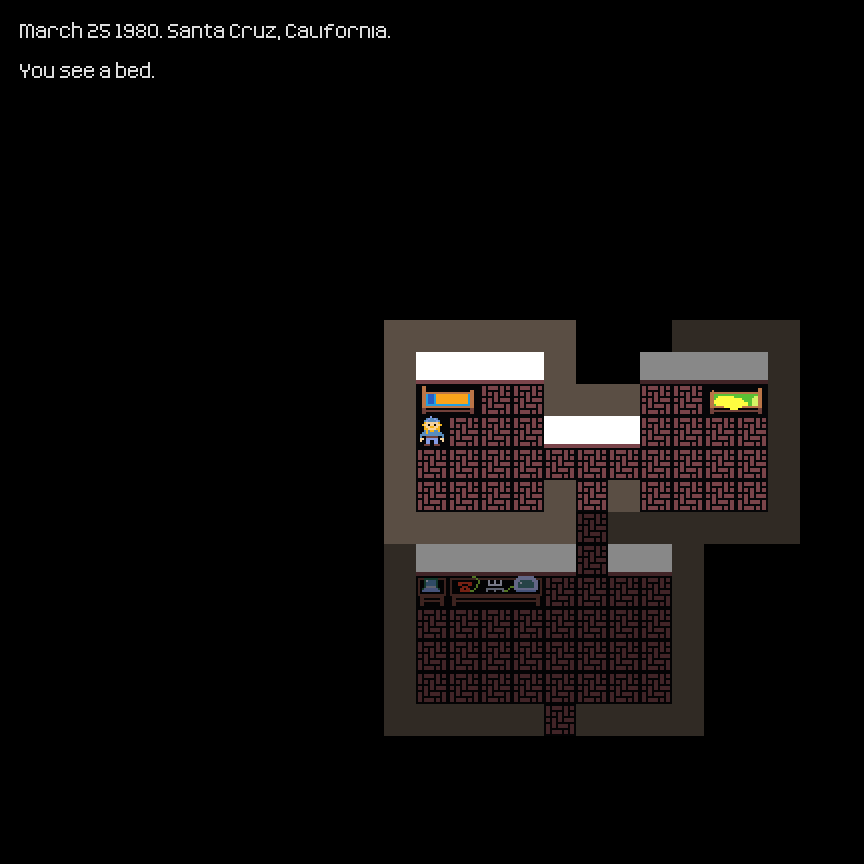 I got development rolling at last, creating some static maps of Glenn and Michael’s apartment in Santa Cruz, California, the Streets of Santa Cruz, and the UCSC Campus. This included creating the first tiles for the game, based on Kenney’s 1bit tileset.