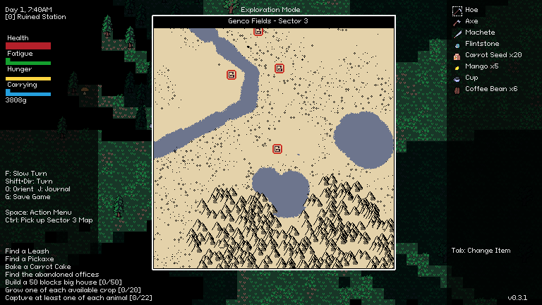 Besides the fix, this version comes with important improvements in the procedural generation that required big internal changes; I am adding more control to the placement of irregular “sectors” in the map, and now I’m attaching data to them, thus allowing things like, for now, berry forests of different types of berry (not just Ouvlurin), and in the future will allow defining different flora and fauna in a much more precise way. We’re going to need this as we continue introducing biomes and then it’s no longer acceptable to randomly place the habitats.