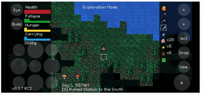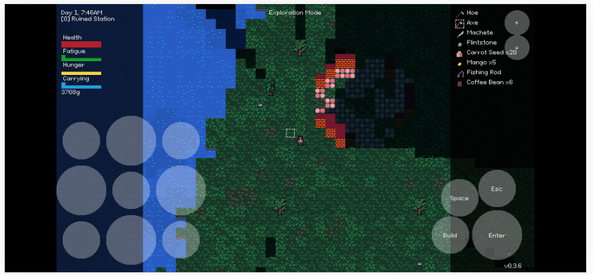 I should however talk a little bit first about 0.3.6; if I were to give it a name it would be “Pleasant Melodies”. The main change it bundled was the inclusion of QuiteGecko’s very improved, longer piano tunes that make exploring the woods feel so much relaxing. It also brought back fishing in a very simplified way.