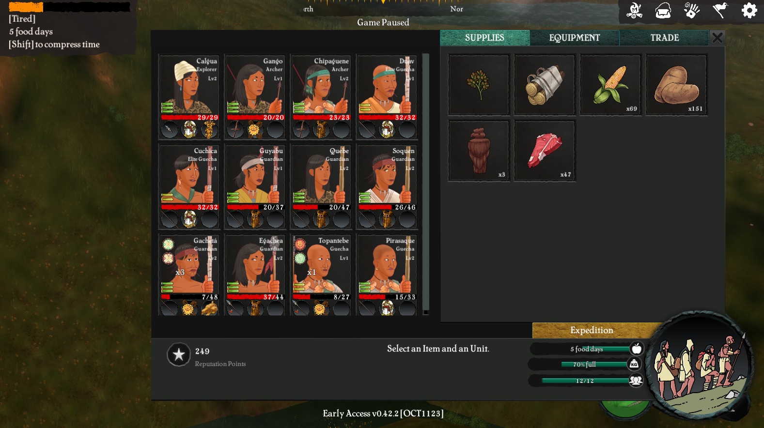 Version 0.42.3 has been in the works for a long time now, however it’s still a minor version because it focused in a small but long requested UI improvement, as well as balancing the start game experience. We were derailed a bit by work in Emerald Woods, client work, but also there’s some ongoing work to add animations for the missing weapons, which you will see probably in the next version.