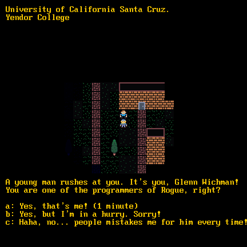 I participated in the “Hidden Heroes” jam organized by IndieCade, creating “Broken Connections“, a game about Glenn Wichman’s quest to save the source code of Rogue, the original roguelike. It was fun to create, got some help from Glenn himself (and Michael Toy) to make it feel cool.