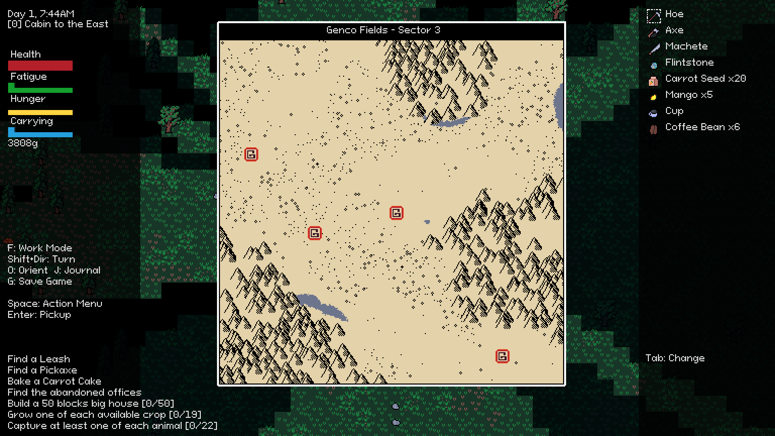 Two versions of Emerald Woods were released, the first one marked the entrance to the project of pixel artist aguaHervida (with whom I had previously worked in Monte del Diablo 7DRL), who redid the sprites for all the game creatures. The other version streamlined the building interface, improved item transferring to containers, and added a film projector so you could access the info in the tapes scattered around.