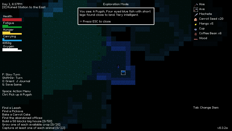 Added rivers to Emerald Woods, as well as “diving” into lakes and deep rivers which included generating the underwater world. This required heavy changes internally to support layered terrain, but it definitively gives a new level of depth to the game.