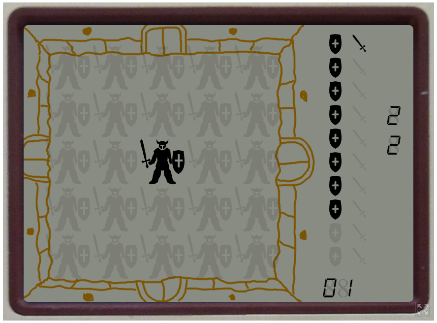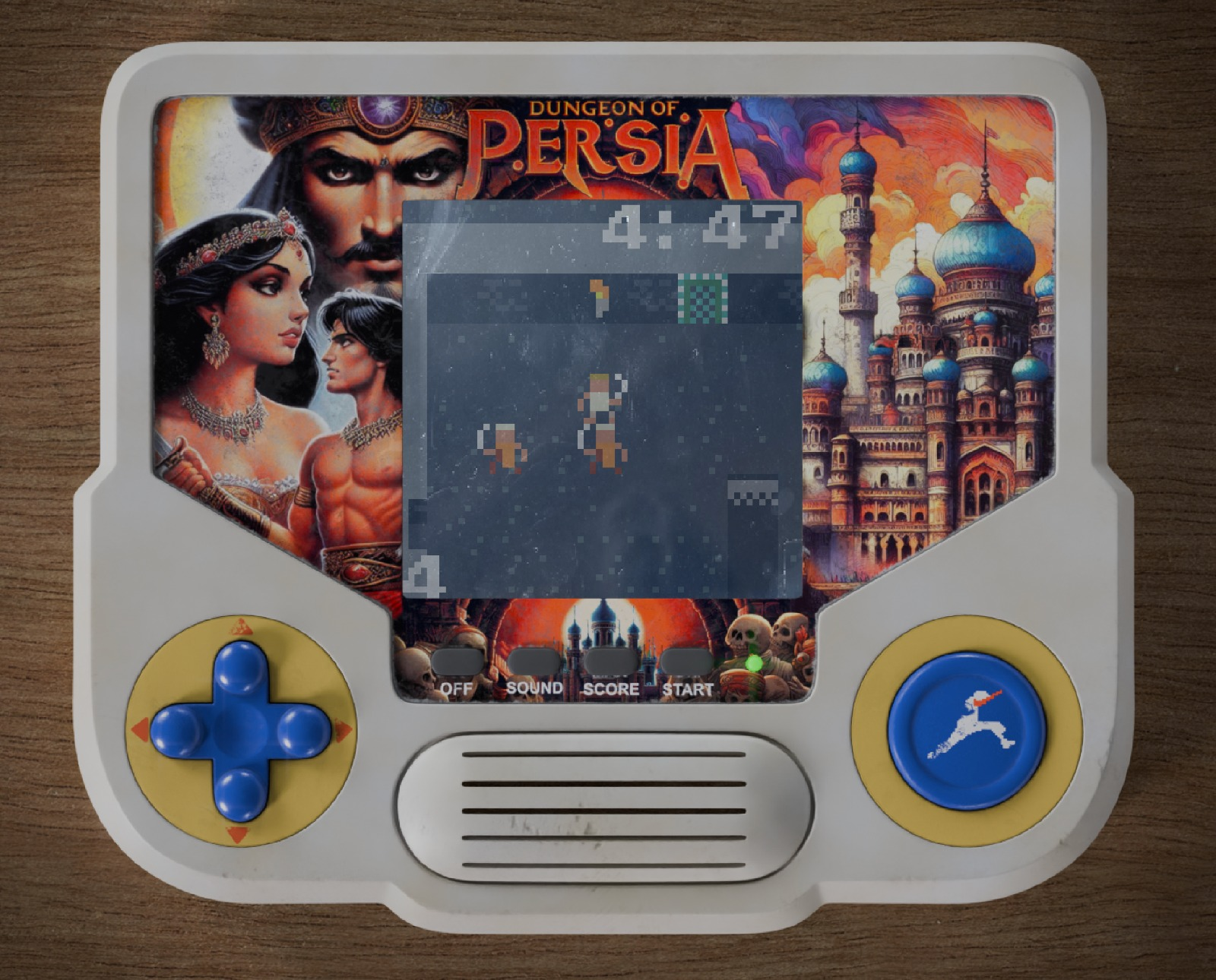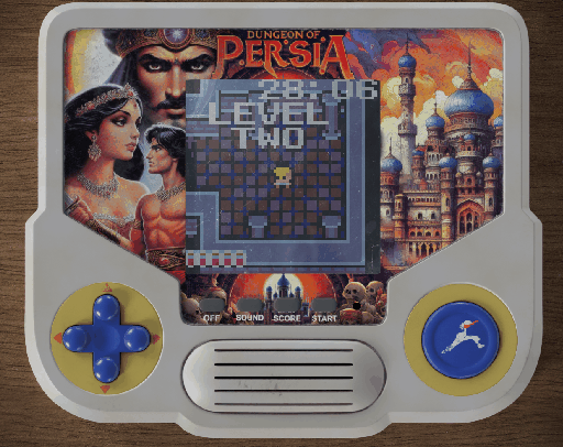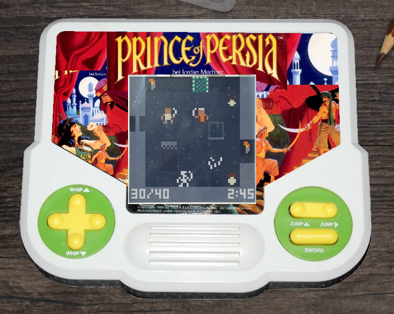 Initially, I envisioned gameplay to be similar to Paladin’s Quest, but with deeper dungeon crawling as allowed by better “hardware” (instead of the very limited simulation of a LCD display, which funnily would have fit more with the Tiger Handheld theme); it was to be much tighter packed, with the prince having to save the princess in 3 minutes, rushing through the dungeon fighting guards, getting potions and weapons, and avoiding traps. Each level would require finding the plate that opened the door to the next level. A lot of it stuck to the very end.