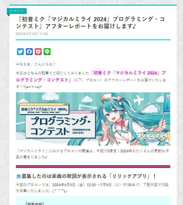This programming contest has the tagline “decorate the creative culture with the power of programming (プログラミングの力で創作文化を彩ろう!)” which was realized with the help of your submission. It was indeed a special and wonderful opportunity for us to explore the future of music and content creation with you.