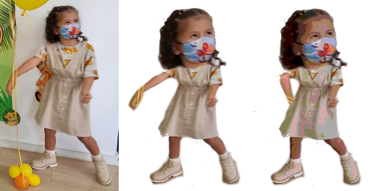 I thought, well, I can take a picture of her, delete the background, and apply some transforms in GIMP, and then some filters, to make it look close enough to a cartoon. Of course, I failed miserably.