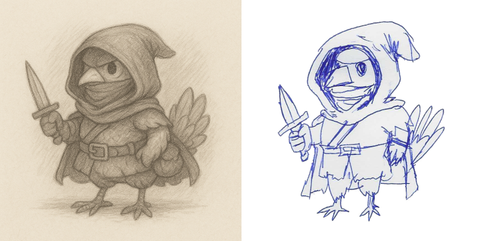 Following on the idea, I generated some sketches (using ChatGPT as well), and then used them as reference to hand-draw my own versions using a blue ballpen.