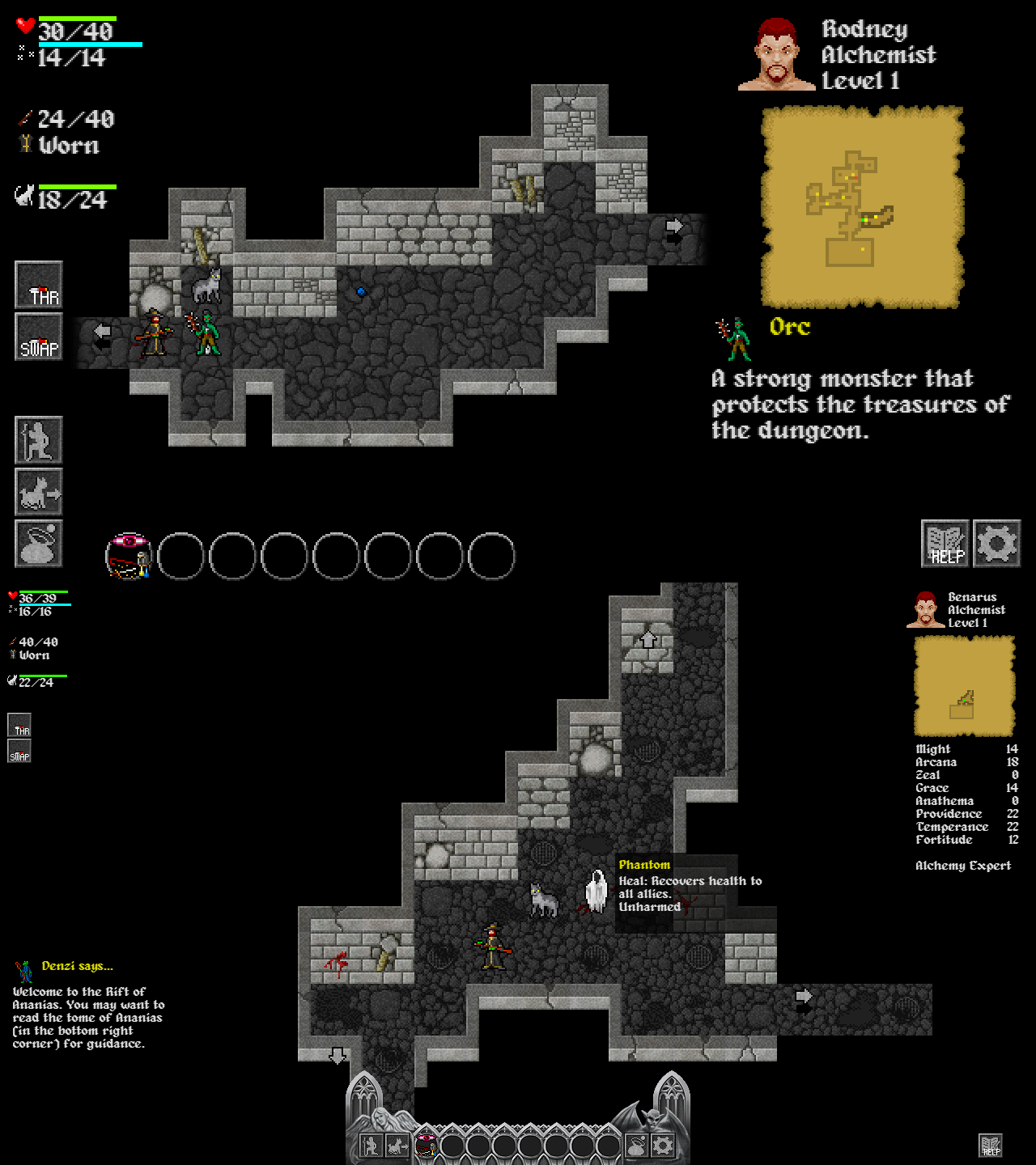 I quickly ditched that idea. My second idea, then, was to make a traditional roguelike that was very easy to play in mobile and tablets.