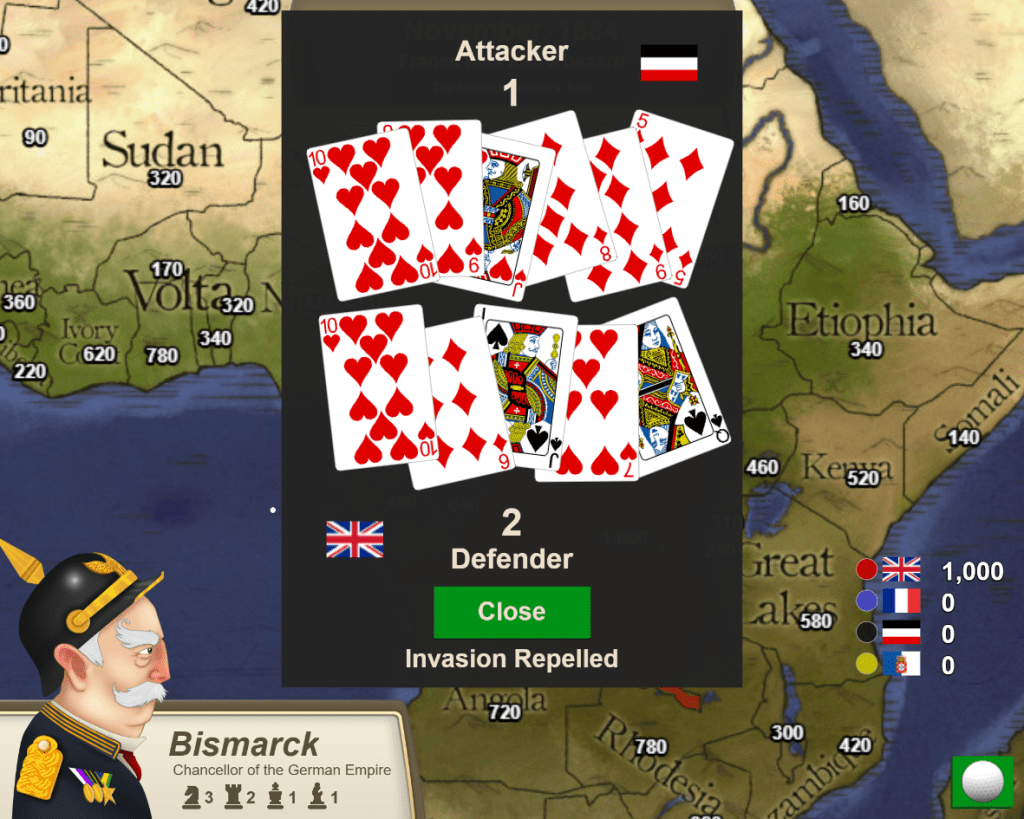 The “cards” game is back, but improved! instead of adding up the numbers on the cards, you only score points for “court” cards (J, Q, K). This makes combat more balanced and fair while still giving an advantage to high military nations. This is coupled with improved visuals and animations.