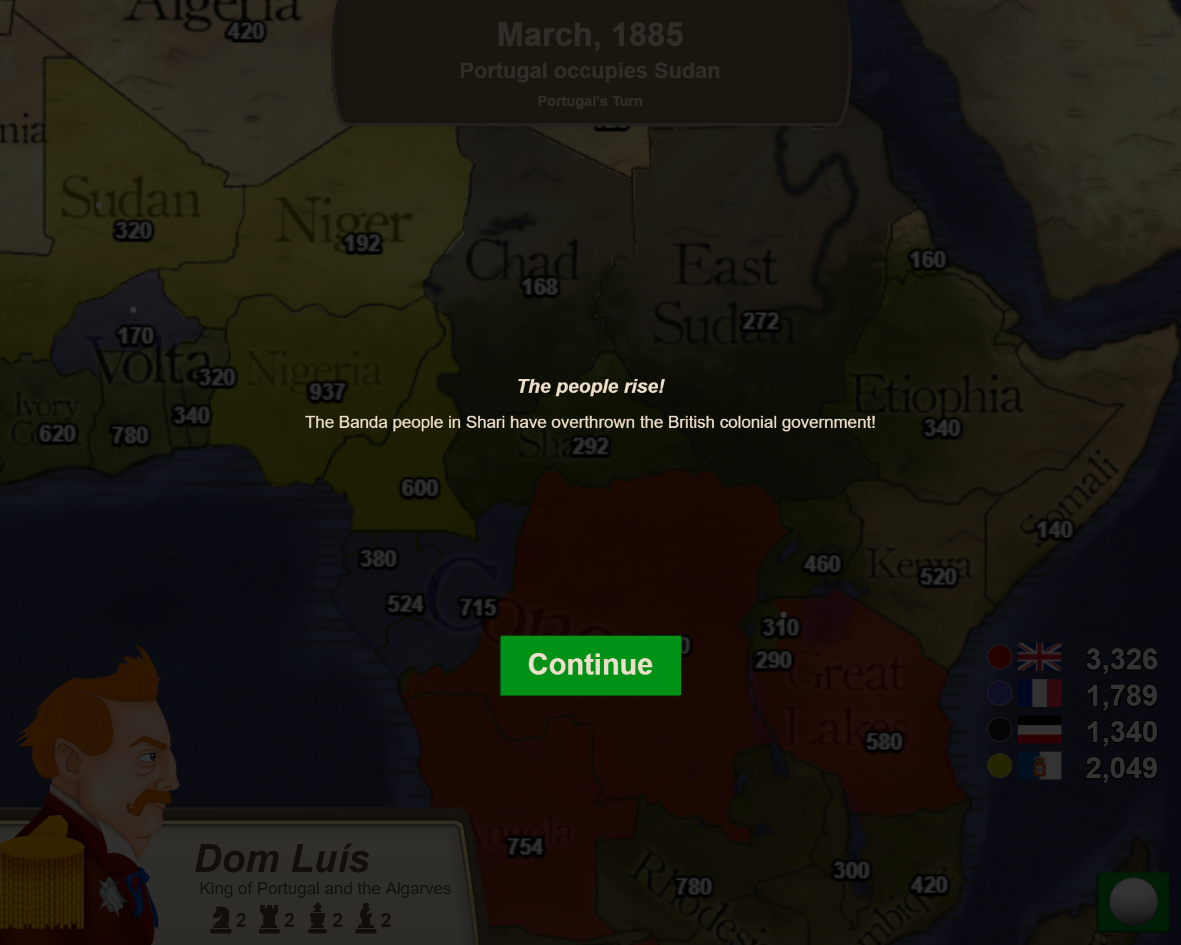 Rebellions were introduced, nations may lose territories as they rebel against colonial rule; the chance and the rebels depend on historical data.