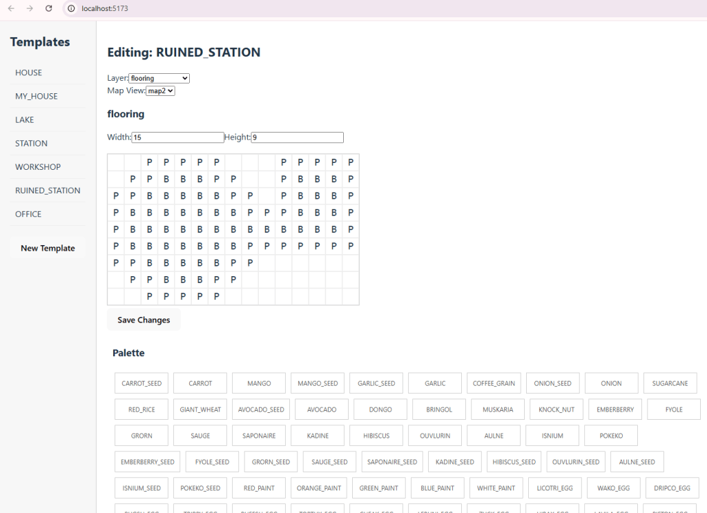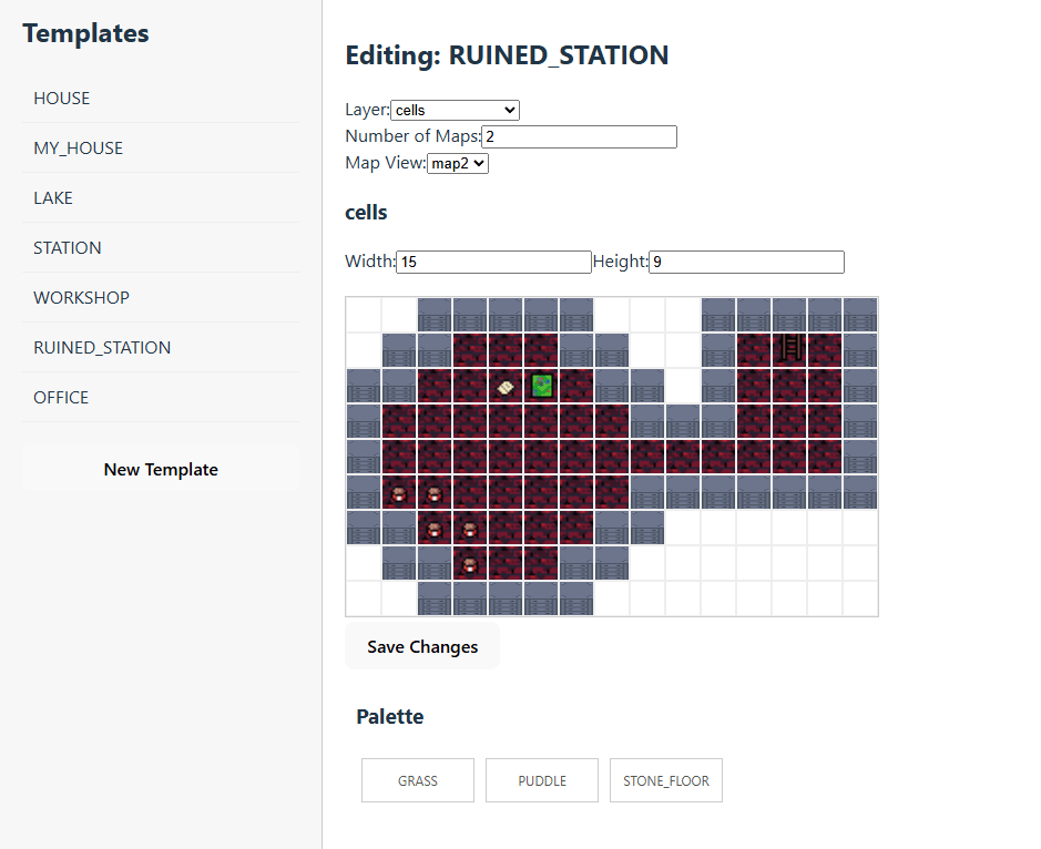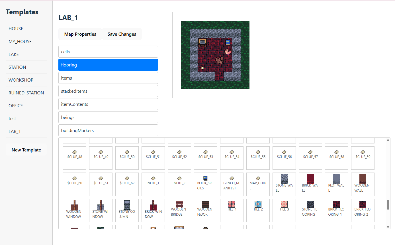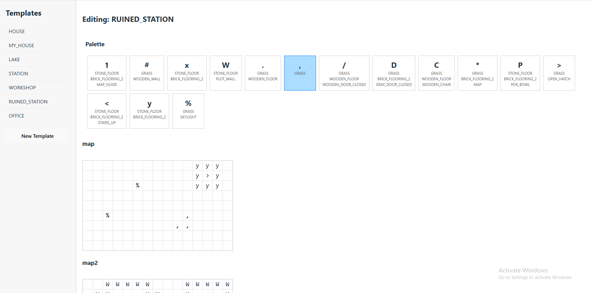- Note that the base structure of templates.json remains, however the charMap is created dynamically based on merging the contents of the different layers, creating new charMap items on the fly (for instance if there's a cell where the cell layers has a cell with id = "GRASS" and the flooring layer has a flooring with id = "BRICK_FLOORING_1", and it's the first cell of that kind, a new charMap entry is created with an incremental identifier and {id = "GRASS", flooringId = "BRICK_FLOORING_1"} This only affects the loading and saving of templates.