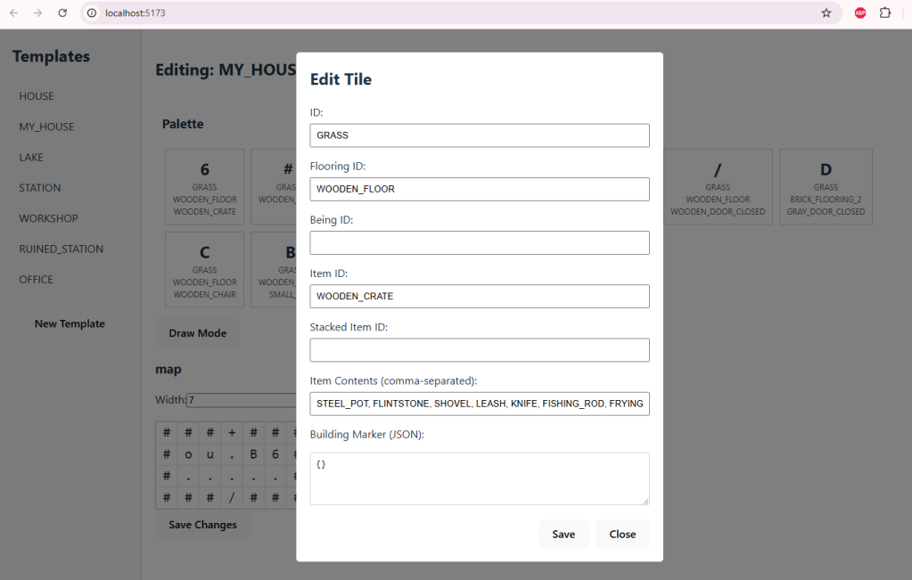 5. I need to be able to edit each charmap item in the palette; clicking one of them should bring a popup where I can change its attributes, for instance: { “id”: “GRASS”, “flooringId”: “WOODEN_FLOOR”, “beingId”: “RULFO” “itemId”: “WOODEN_CRATE”, “stackedItemId”: “BOOK_SPECIES” “itemContents”: [ “STEEL_POT”, “FLINTSTONE”, “SHOVEL”, “LEASH”, “KNIFE”, “FISHING_ROD”, “FRYING_PAN” ] “buildingMarker”: { “type”: “STATION”, “description”: “Genco Station” }, } All the attributes are optional except for the id