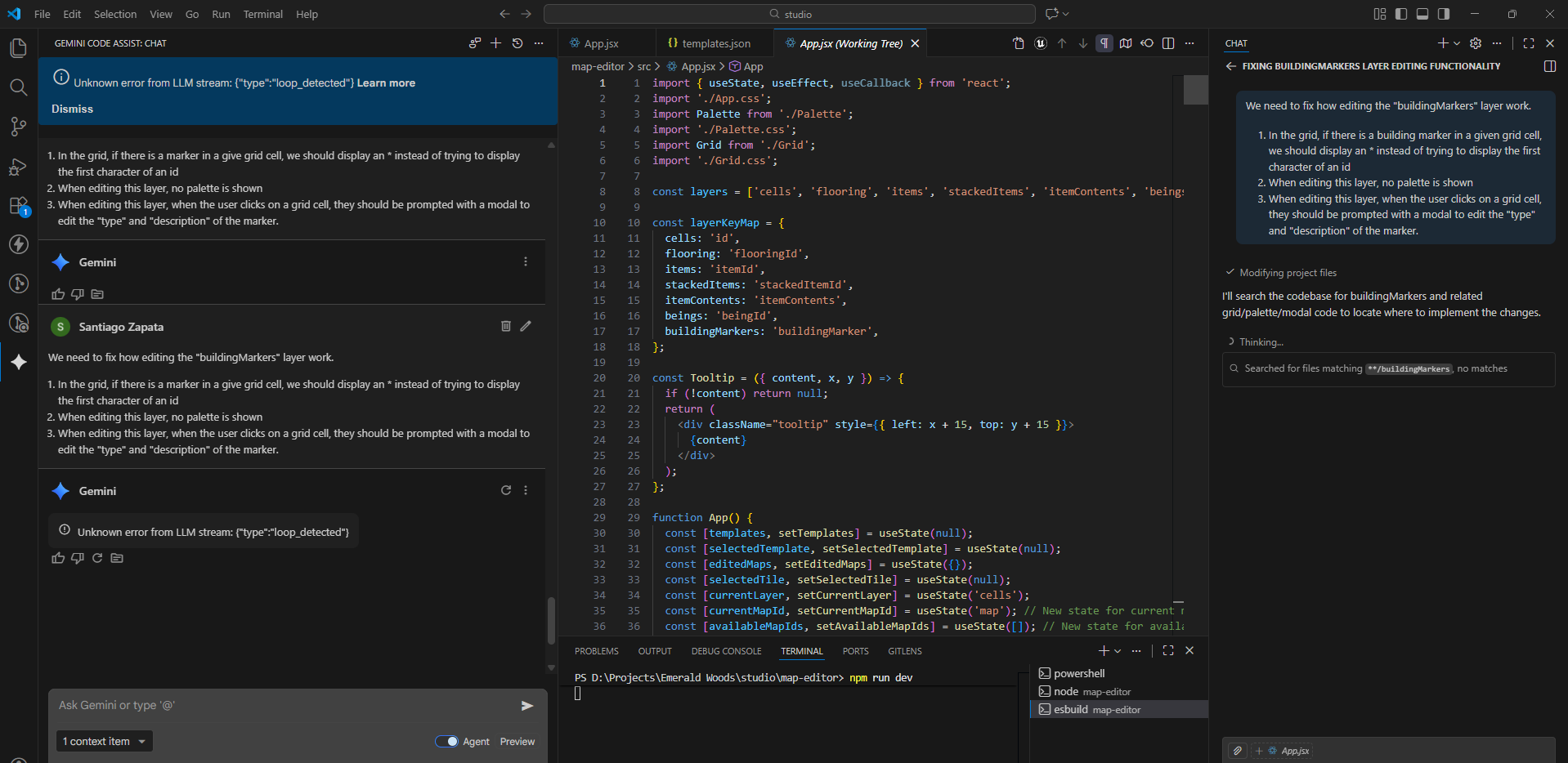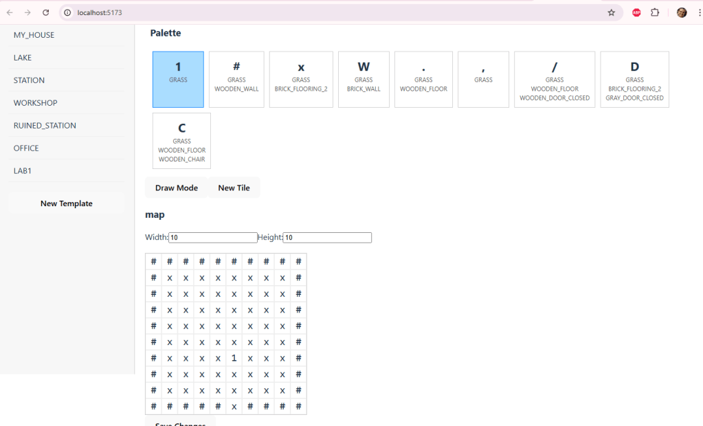 1. I need to build a tool, a map editor, that will read, and allow me to edit the contents of templates.json. It should allow me to select a template, see its data loaded, and then being able to edit the “charMap” and “map” for that template. I should also be able to create new templates.