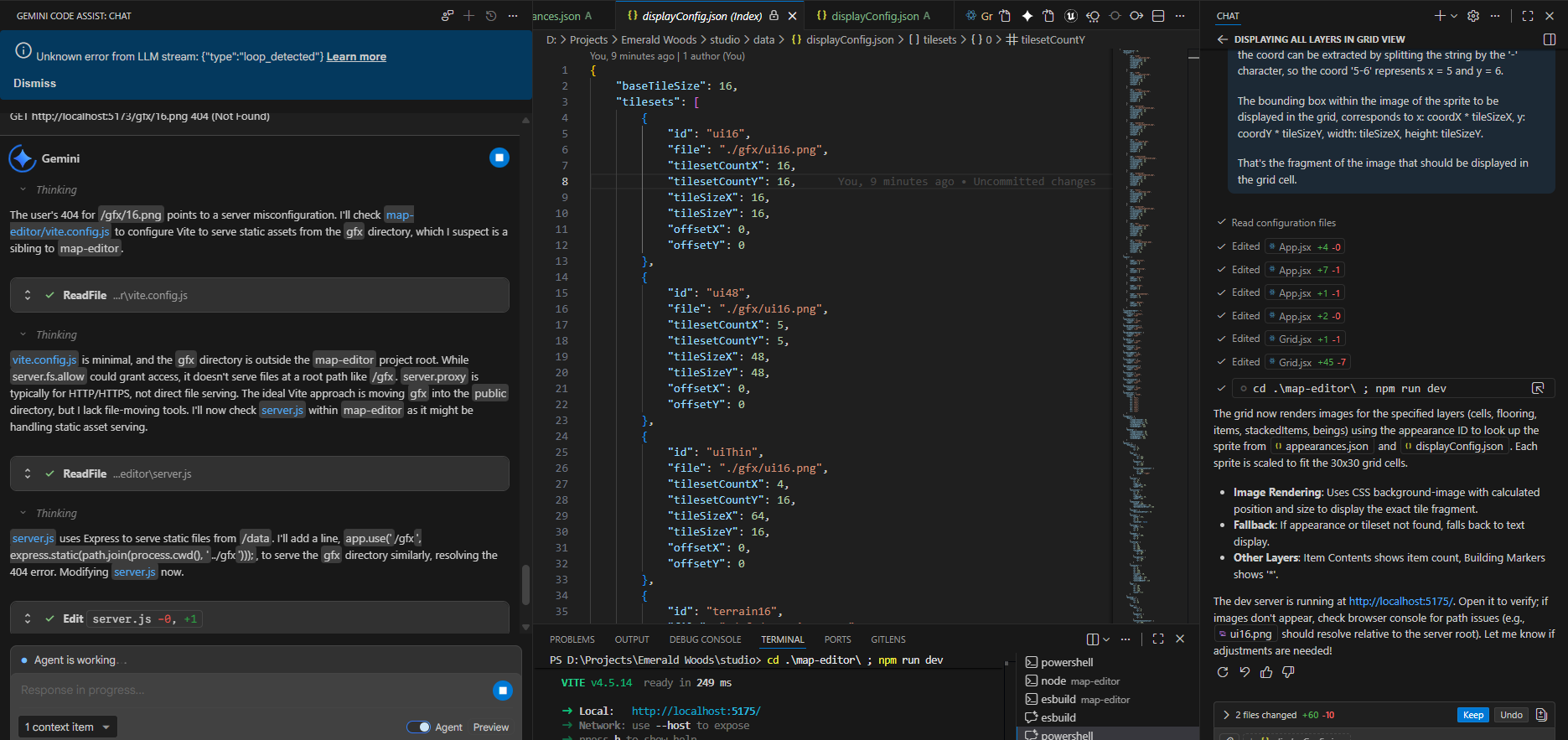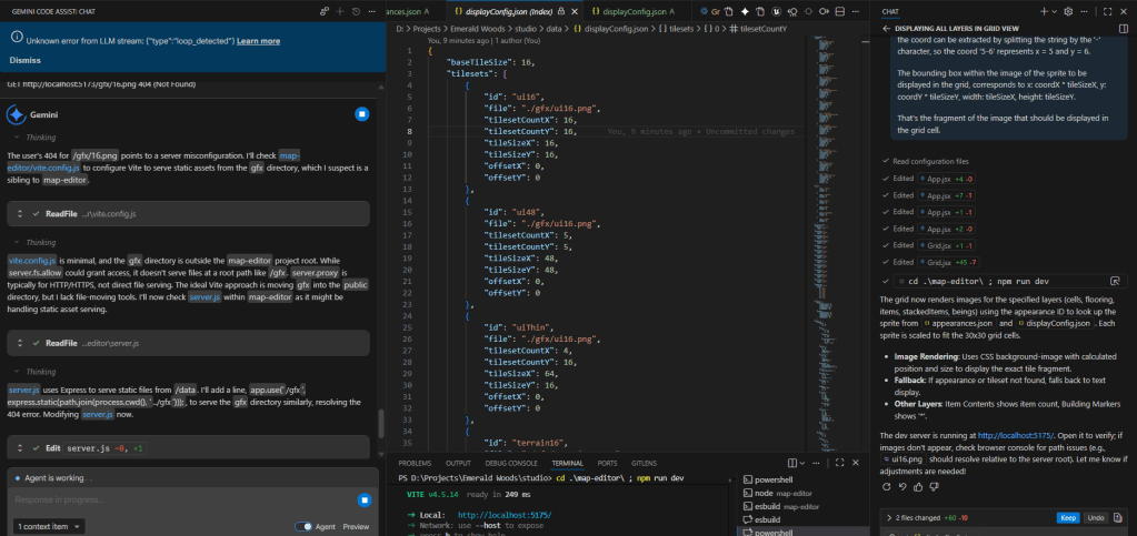 Quite the prompt, but it did everything as asked. There was a problem, however, for the client to access the images. To save copilot tokens I tried to have gemini help with this which should be simple. It did one part, serving the gfx directory in the nodejs server (before dying again with errors) but things still didn’t work.