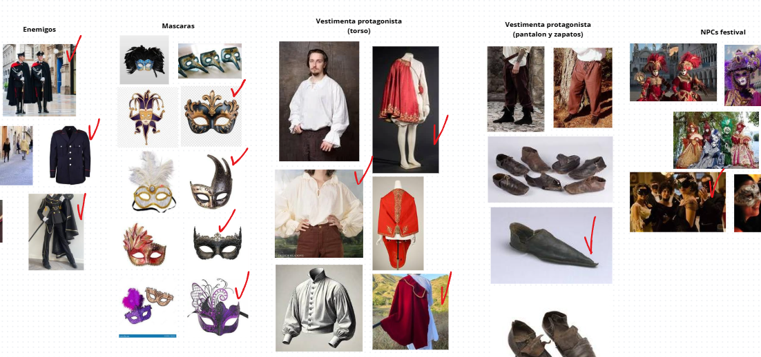 The other important visual aspect of the game was, of course, the main character. It all started with exploring and researching a little bit on late renaissance Italian fashion (alongside some other world elements)