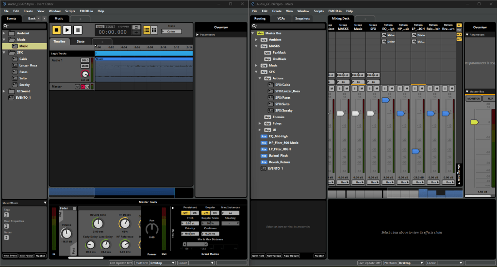 Anyways, one of the very first things we did was to set up FMod and make sure we’d be able to hook events from Unity and have them play back. With this on place, Santiago was able to dig into the details of the implementation of each event, and then we could reconnect back periodically to integrate the progress.