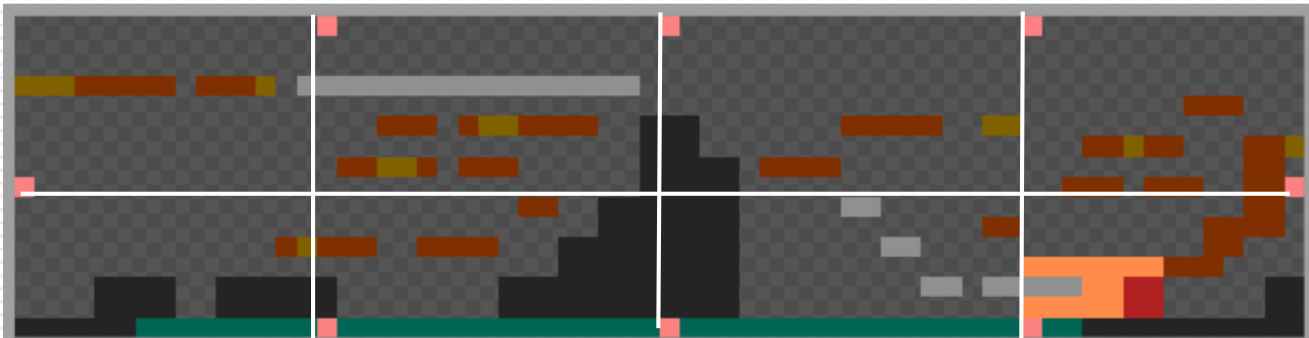 So the next step we took was to create digital versions of these sketches, Jean had the idea to use a pixel art program as a makeshift level editor. Already here we managed to find tweaks that would be needed to acomodate to a screen by screen level structure.