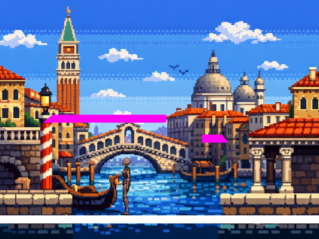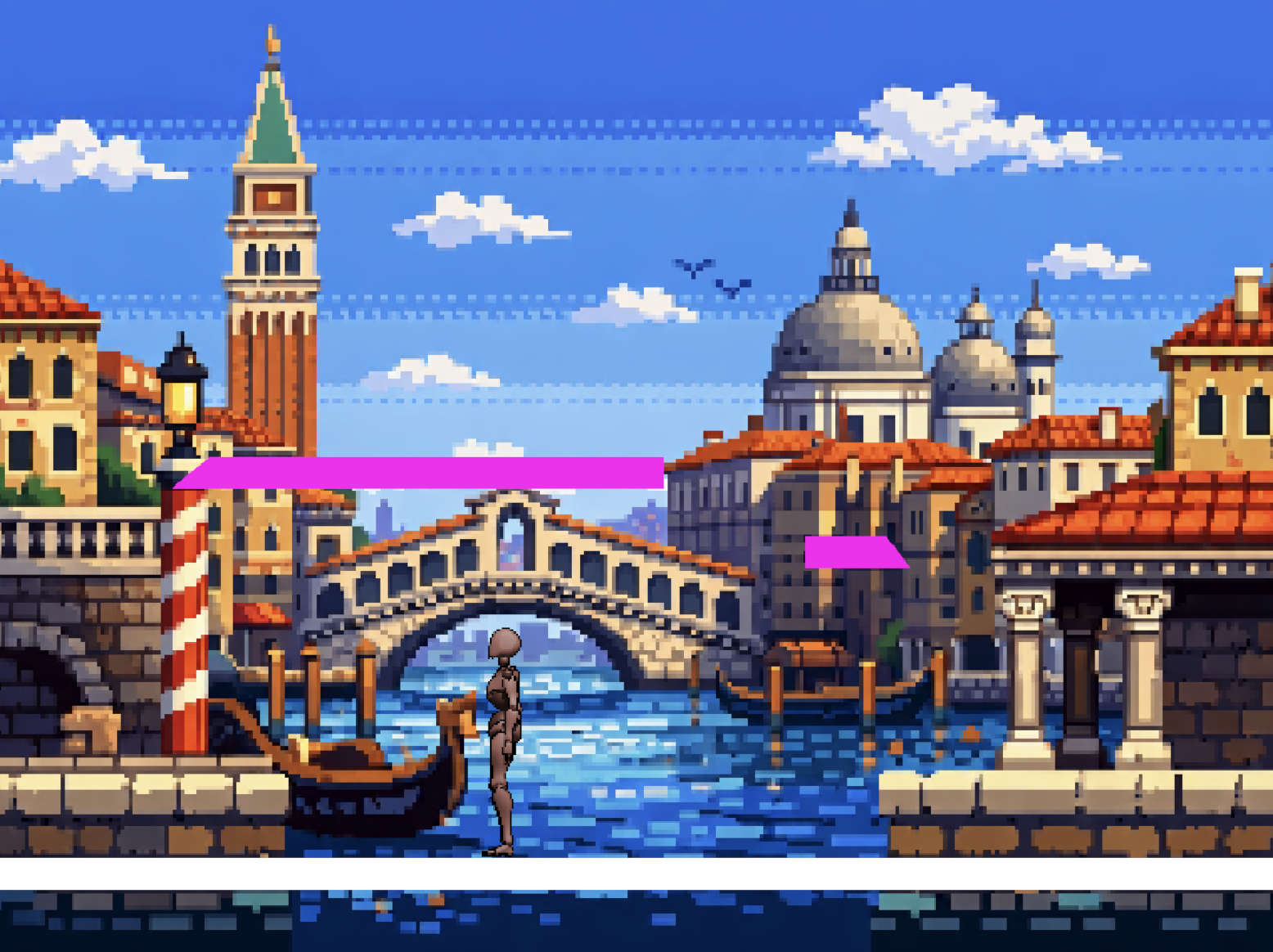 Approaching the end of the jam, she still managed to create some nice screens for Venice and its canals, which I decided to use to strenghten the theme of the game and not so much as playable areas; contrasting to the tunnels, the walkable surfaces in these is part of the background, making them feel much more organic.