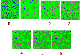 Los resultados de hacer correr 6 generaciones de autómatas celulares sobre una matriz generada aleatoriamente con contenidos proporcionales de las diferentes celdas, y con la aplicación del patrón de bosque descrito en la figura 8, se muestran en la figura 9.
