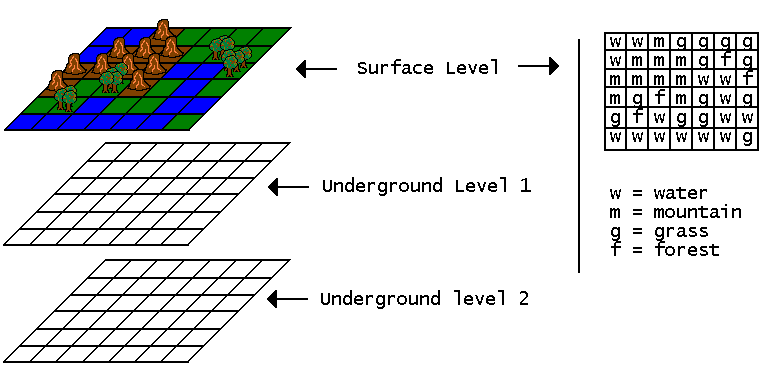El proceso de generación para el interior del mundo se basa el la estructura de masa continental calculada en el primer paso. El nivel del mar de esta estructura es recalculado con una menor proporción de agua buscando dar la impresión de que los mares se estrechan mientras el mundo es más profundo. Finalmente, todo lo que no sea mar es reemplazado por roca sólida o piso cavernoso, contrastando con la variación de temperatura y lluvia presente en el nivel de la superficie.