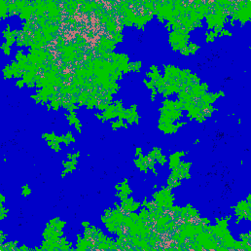 Usando este patrón se determinan las reglas del autómata celular, por ejemplo que una celda de agua se convertirá en tierra si no tiene más de dos celdas de agua contiguas, y una celda de tierra se convertirá en árbol si tiene más de 2 celdas de árbol contíguas.