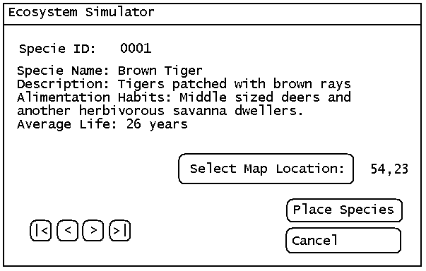 Retomando el ejemplo del programa que simula un ecosistema, el generador de mundo podría estar antecedido por una interfaz que permita al usuario definir la distribución inicial de los “nidos” de cada especie animal y vegetal; la simulación sería luego ejecutada con el fin de monitorear la población de cada especie llegando a nuestras conclusiones experimentales. Esta interfaz podría ser similar a la mostrada en la figura 10.